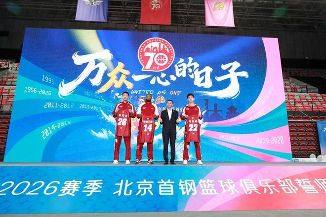 2026年,北京篮球将迎来七十周年里程碑。在这个极具历史意义的赛季,北京首钢大家庭也迎来一批新鲜血液——北京北汽男篮新球员赵睿、李永瀚、张知垚、斯佩尔曼,北京首钢园女篮潘臻琦、李一凡、冯可心、王小青、徐凤威、豆中秋、凯·詹姆斯、蒂芙尼·米切尔、米娅·洛伊德。在誓师大会上,这些新面孔从俱乐部总经理张云松手中接过新赛季球衣,宣告着北京男女篮已经集结完毕,将一起迎接新挑战,开启新征程。
