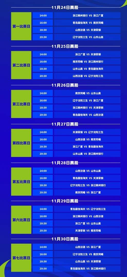 辽宁U19男篮将在甘肃嘉峪关赛区A2组进行,同组对手有浙江、广厦、青岛、南京、山西、天津和山东。辽宁U19男篮的赛程已经出炉,11月24日晚上20:30,辽宁对阵山东。11月25日晚上20:30,对阵山西。11月26日下午16点,对阵广厦,11月27日下午14点,对阵天津。11月28日晚上18:30,对阵浙江,11月29日下午14点,对阵青岛。11月30日下午16点,对阵南京。
