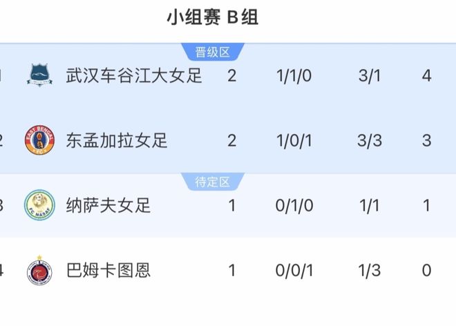 由于本届亚冠只有3个小组12支参赛队,每个小组前2名和成绩最好的2个第3名晋级8强。另外2个小组3轮比赛都已经结束,A组第3名3轮过后只有3分,因此积4分的武汉女足已经提前1轮出线。